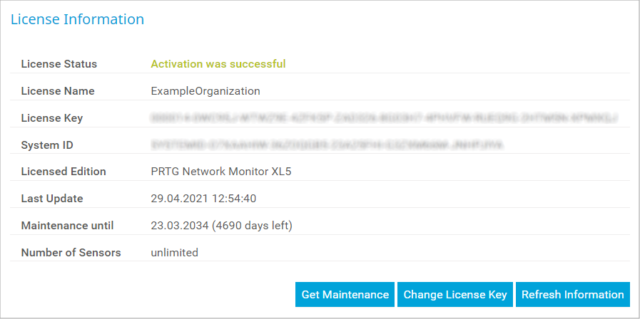 The License Name (PRTG Network Monitor only), license key, and system ID make up your license information.