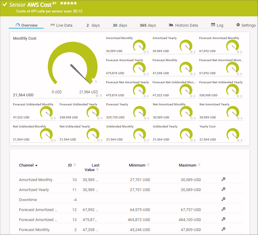 PRTG creates two overview channels (monthly and yearly) for every additional cost type that you select.