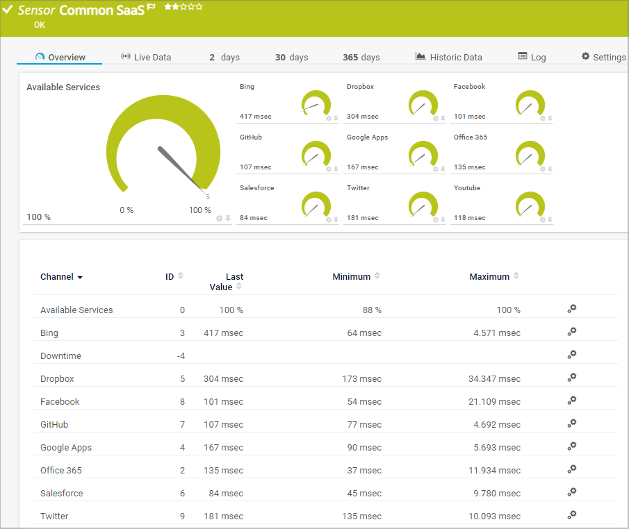 The Common SaaS sensor monitors the availability of several software as a service (SaaS) providers.