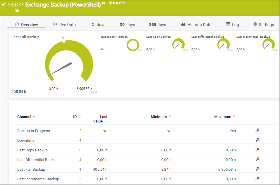 The Exchange Backup (PowerShell) sensor monitors backups of an Exchange server via Remote PowerShell.