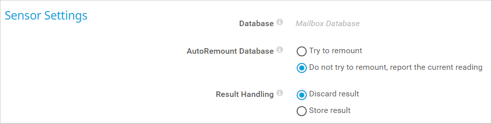 The Exchange Database (PowerShell) sensor monitors database information of an Exchange server via Remote PowerShell.