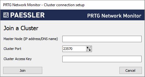 - Click Join a Cluster to add this installation to a cluster that already has a master node. The current PRTG core server is then a failover node.