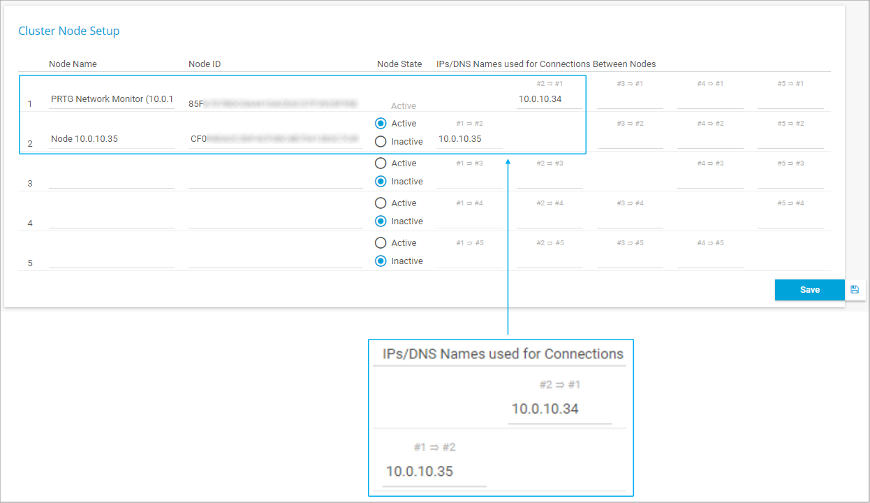 If you use remote probes outside of your local network, for each PRTG core server in the cluster, use a Domain Name System (DNS) name or IP address that the remote probes can reach from the outside. Enter the entries in the Cluster Node Setup table accordingly. The addresses must be valid for both cluster nodes to reach each other and for remote probes to individually reach all cluster nodes. Remote probes outside your LAN cannot reach private IP addresses or DNS names.