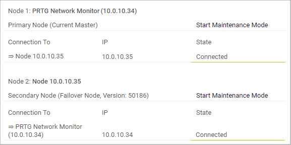 In two browser windows, log in to the PRTG web interface of both of your PRTG core servers. Open the Cluster Status tab in both windows. You should see the cluster status with the two cluster nodes in a Connected state after a few minutes.