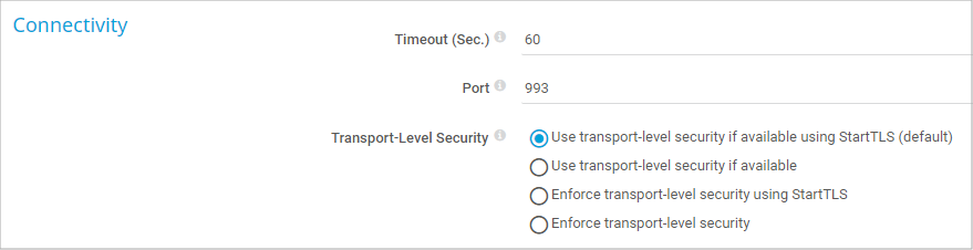 - Use transport-level security if available using StartTLS (default): Try to connect to the server via a Secure Sockets Layer (SSL)/Transport Layer Security (TLS) secured connection and StartTLS. If the server does not support this, the sensor tries to connect without connection security.
