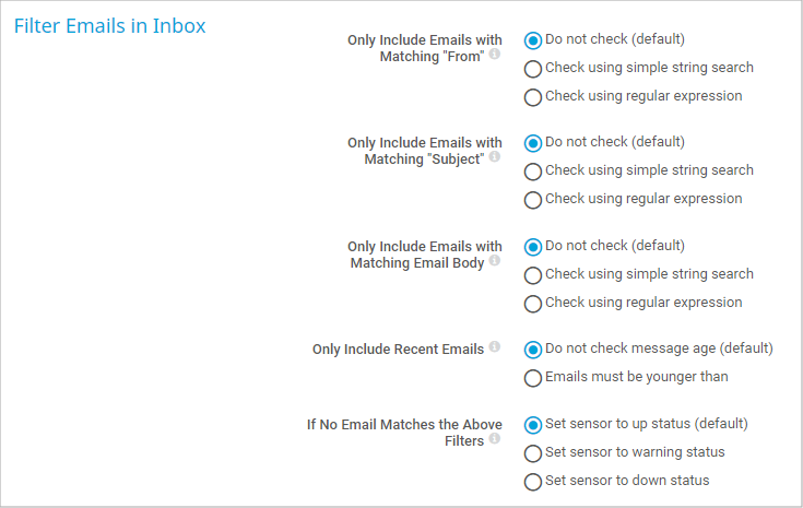- Set sensor to down status: Show the Down status if the sensor does not find any email in the mailbox that matches the filters.