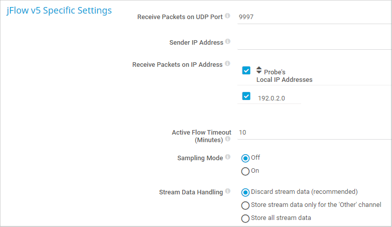 Enter the IP address of the sending device that you want to receive the jFlow data from. Enter an IP address to only receive data from a specific device or leave the field empty to receive data from any device on the UDP port.