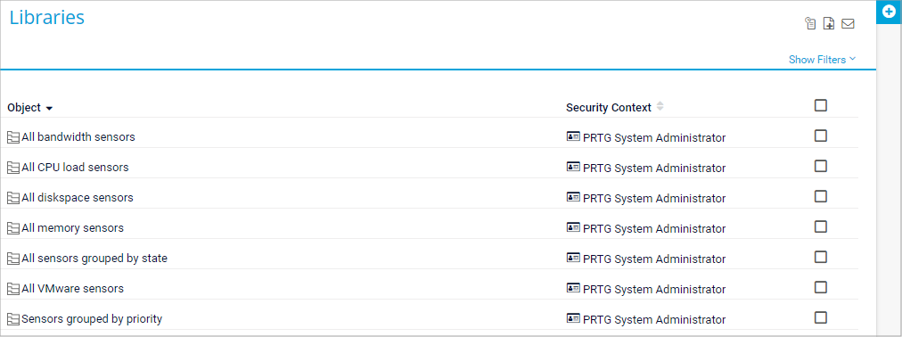The following libraries are automatically created when you install PRTG for the first time. Some of these libraries are initially empty, but as you add more sensors, PRTG automatically fills them according to the filter settings defined for the library nodes:
