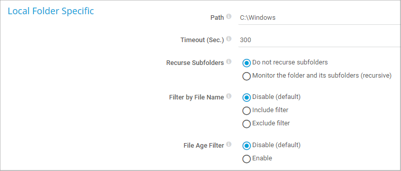 Enter a timeout in seconds. If the scan of the folder takes longer, the sensor cancels the request and shows an error message. If two consecutive scans fail, the sensor shows the Down status. The default value is 300 seconds (5 minutes). The maximum value is 1079 seconds (17 minutes and 59 seconds).