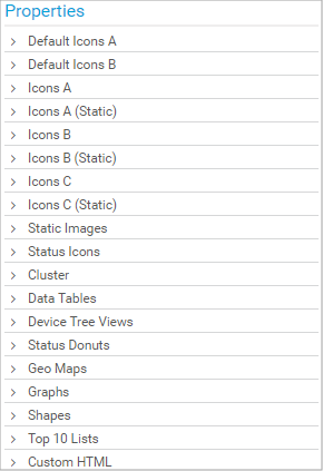 Use the Properties section to define how to display the map item, for example, as an icon, a map, a table, or a graph. Select the appearance of a map item from different categories.