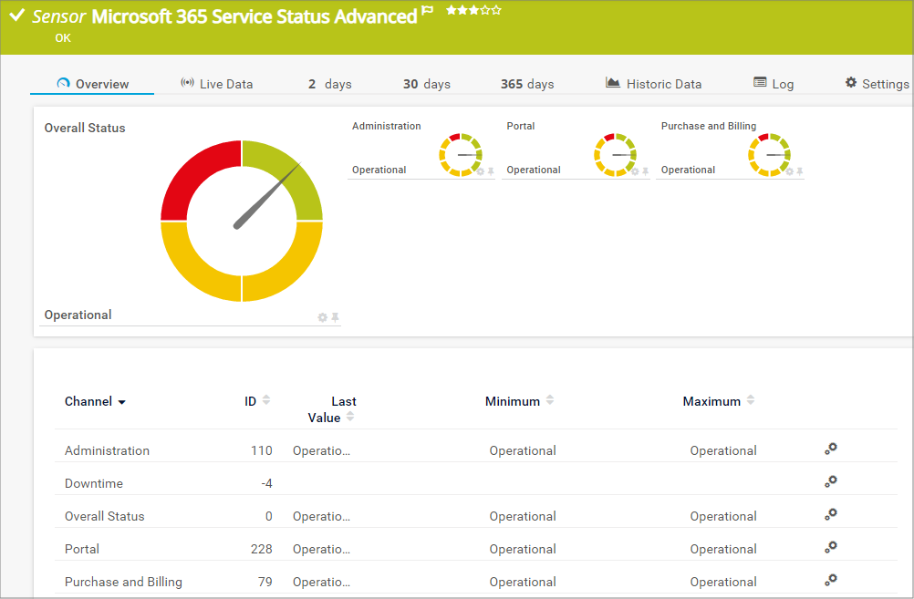 The Microsoft 365 Service Status Advanced sensor monitors the detailed status of all services of a Microsoft 365 subscription.
