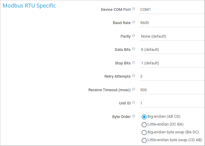 The Modbus RTU Custom sensor connects to a Modbus Remote Terminal Unit (RTU) server and monitors up to five returned numeric values.