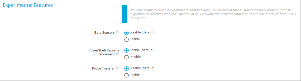 The operating methods of the experimental features can change at any time. Do not expect that all functions work properly, or that the experimental features work as expected at all. Be aware that Paessler can remove these features at any time.