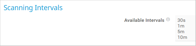 Define the intervals available in the dropdown list of every object's settings. In the text field, enter one value in each line. Use s, m, h, and d to define seconds, minutes, hours, and days. By default, the following scanning intervals are available: