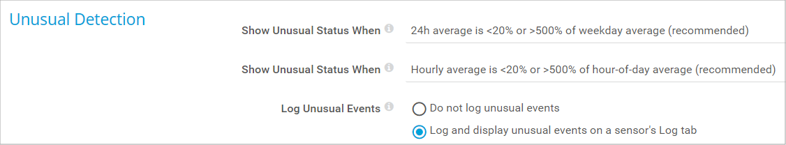 You can define the granularity of the unusual detection, that is, how big the difference must be to cause the Unusual status. If you disable the unusual detection by setting both settings to Never, sensors never show the Unusual status.