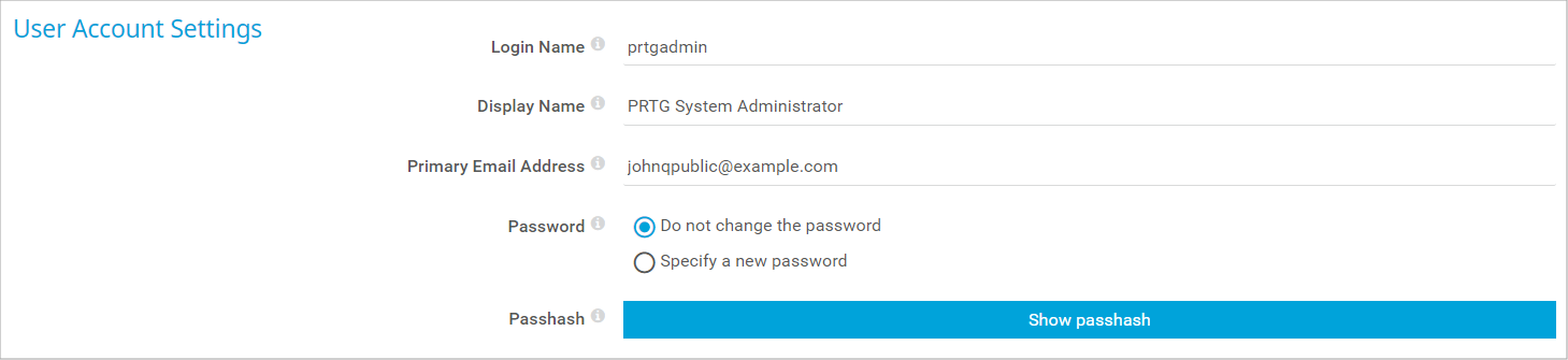 Click Show passhash to display the API passhash of the user account. This is recommended for authentication for the PRTG API.