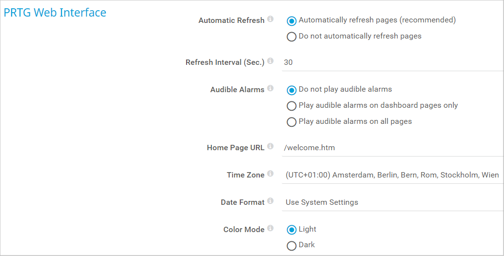 - Automatically refresh pages (recommended): PRTG automatically refreshes single page elements on web pages in the PRTG web interface.