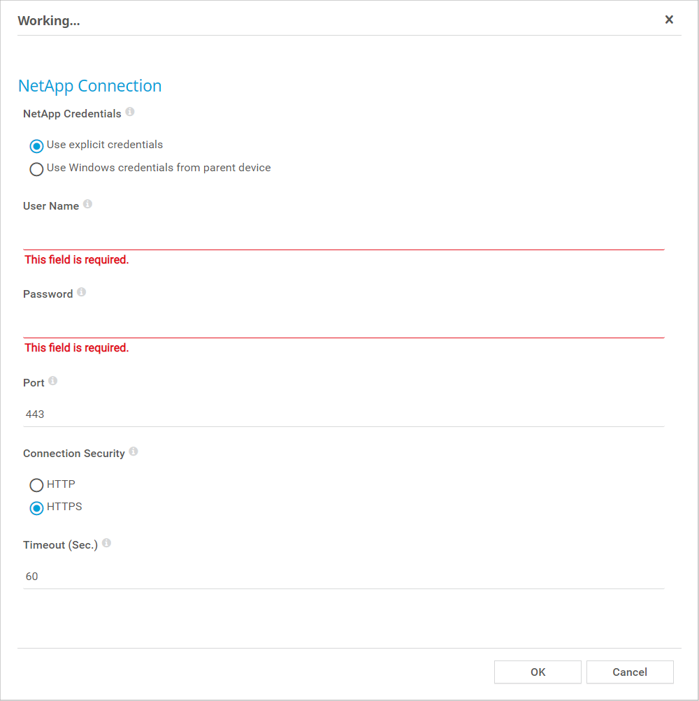Defining credentials in the parent device is useful if you add several NetApp sensors to this device because you do not need to individually enter credentials for each NetApp sensor.