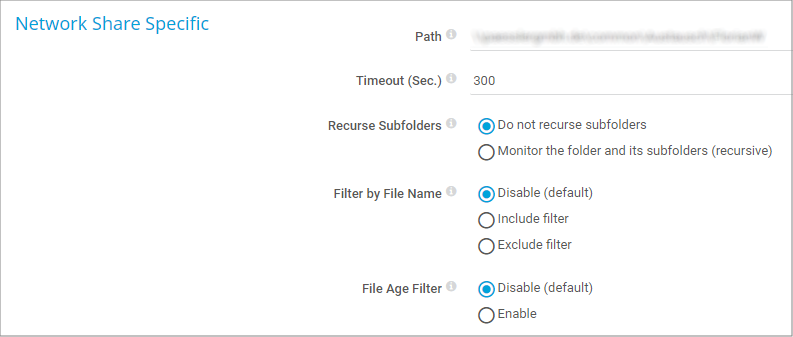 Enter a timeout in seconds. If the scan of the folder takes longer, the sensor cancels the request and shows an error message. If two consecutive scans fail, the sensor shows the Down status. The default value is 300 seconds (5 minutes).