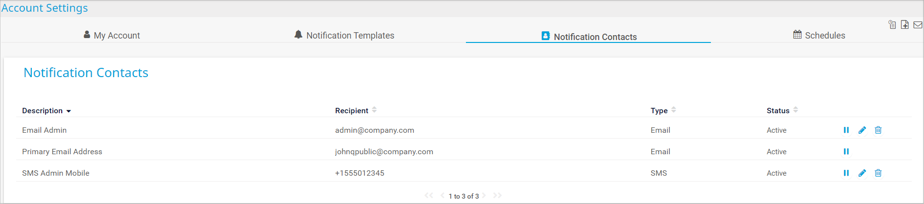 Click the Notification Contacts tab to show a list of all notification contacts for the user account. You have the following options: