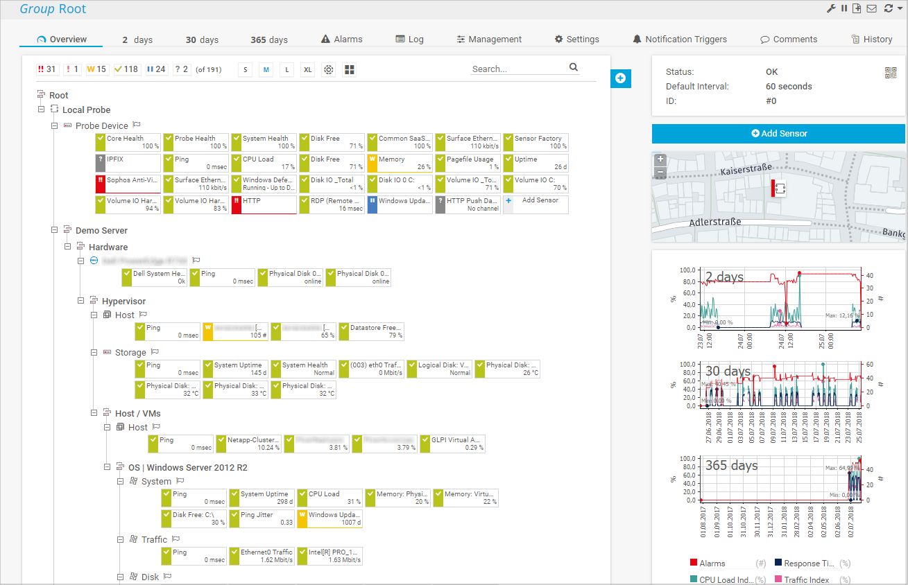 Here you can see a sample configuration of a device tree with the local probe, several groups, devices, and their sensors: