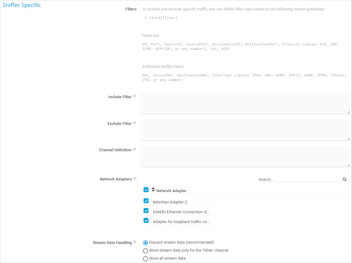 - Discard stream data (recommended): Do not store the stream and packet data.