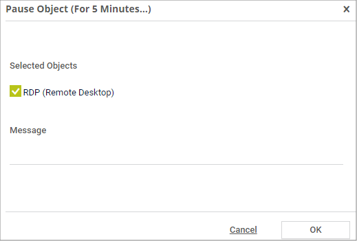 When you select a pause option, a dialog appears in which you can optionally enter a message. PRTG shows the message in the object's status message as long as the object is in the Paused status. Confirm with OK to pause the object.