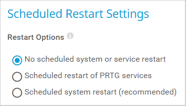 - No scheduled system or service restart: Do not automatically perform a scheduled restart of services. We recommend that you manually restart the PRTG core server system every few weeks. You can initiate a restart of the PRTG probe service in the Administrative Tools in the PRTG web interface.