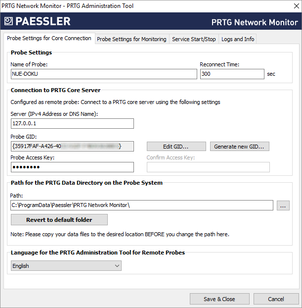 Choose the language for the PRTG Administration Tool on the remote probe. The default language is English.