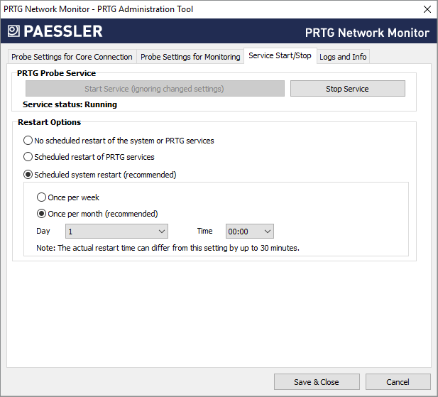- No scheduled system or service restart: Do not automatically perform a scheduled restart of services. We recommend that you manually restart the PRTG core server system every few weeks. You can initiate a restart of the PRTG probe service in the Administrative Tools in the PRTG web interface.