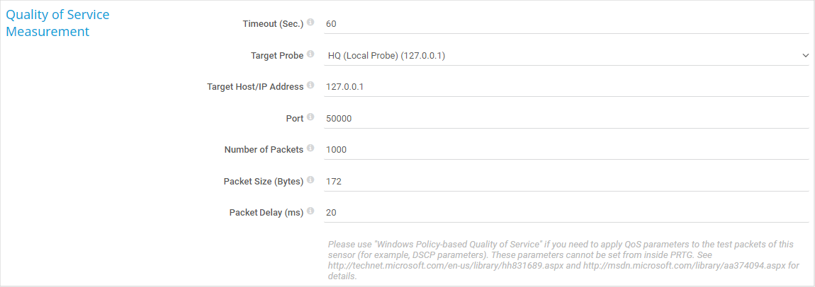 In PRTG Hosted Monitor, you can only select a different remote probe as the target probe. QoS measurements for connections to the hosted probe are not possible.