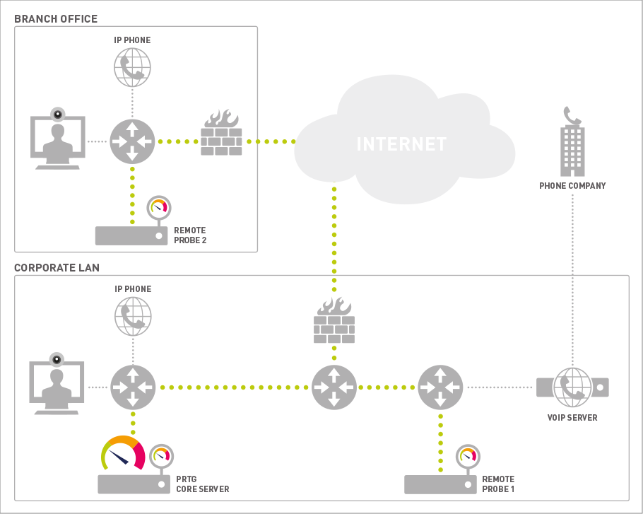 The QoS sensors measure the quality of service by sending UDP packets between two probes. This means that you can test any network connection in your network by placing a remote probe on (or near) each end of the connection and measuring the connection quality between them. This way, you can find network issues that can affect VoIP sound quality or cause video streaming issues.
