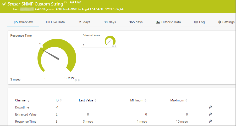 The SNMP Custom String sensor monitors a string returned by a specific object identifier (OID) via the Simple Network Management Protocol (SNMP). It can check for keywords. If you want to set limits to the channel value, you can also extract a numeric value contained in the string.