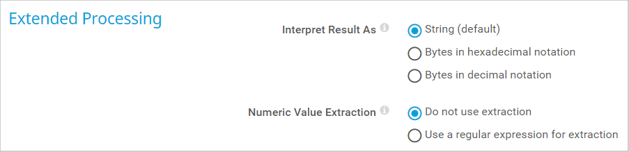 - Bytes in hexadecimal notation: Handle the result as bytes in hexadecimal notation. For example, select this option if you monitor MAC addresses.