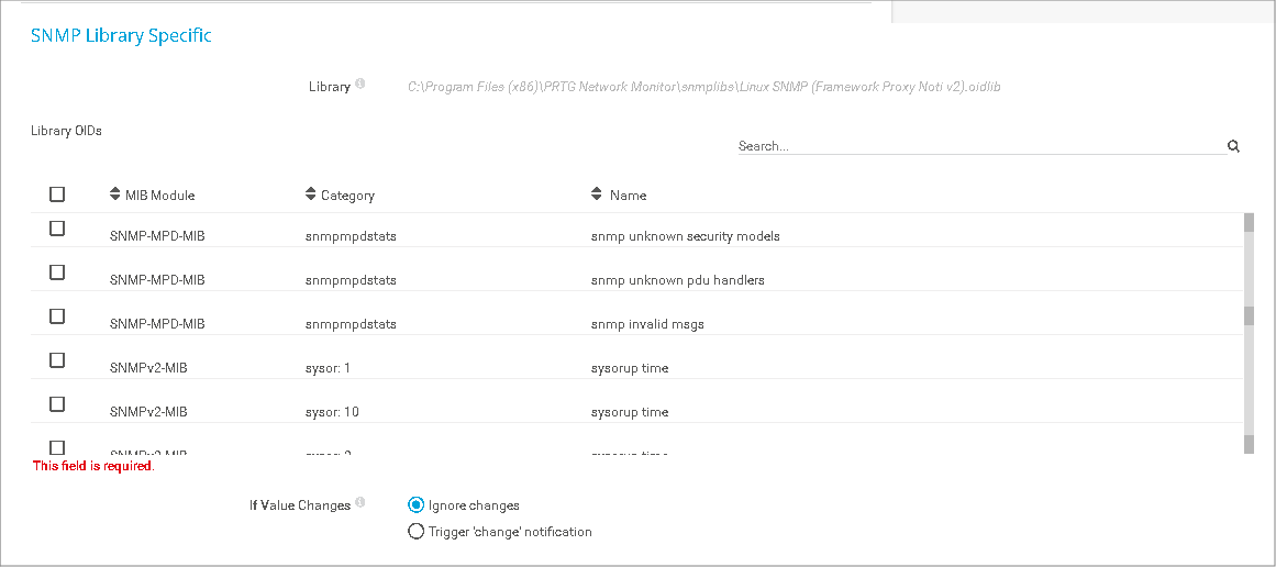 PRTG shows a list of .oidlib files that are available on the system. This list contains all library files in the \snmplibs subfolder of the PRTG program directory. It contains both the default PRTG library files and your own library files.