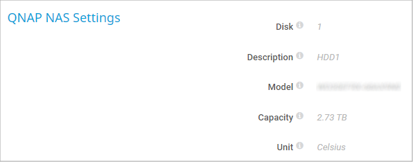 The SNMP QNAP Physical Disk sensor monitors a physical disk in a Quality Network Appliance Provider (QNAP) network-attached storage (NAS) via the Simple Network Management Protocol (SNMP).