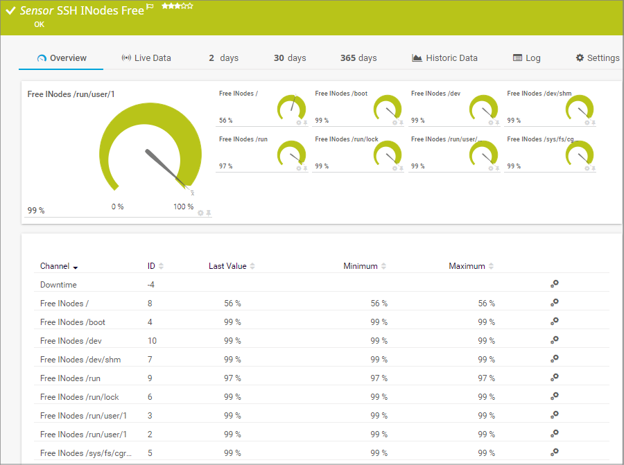 UNIX file systems only allow a limited number of index nodes. If the limit is exceeded, no more data can be stored, although free space might still be available. This sensor informs you before one of your drives runs out of INodes.