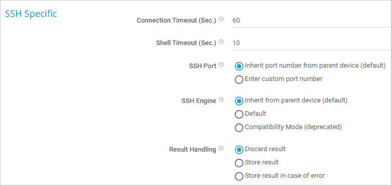 - Inherit from parent device (default): Use the SSH engine that you defined in the parent device settings or higher up in the object hierarchy. If you have not changed the SSH engine, this is the recommended default engine.