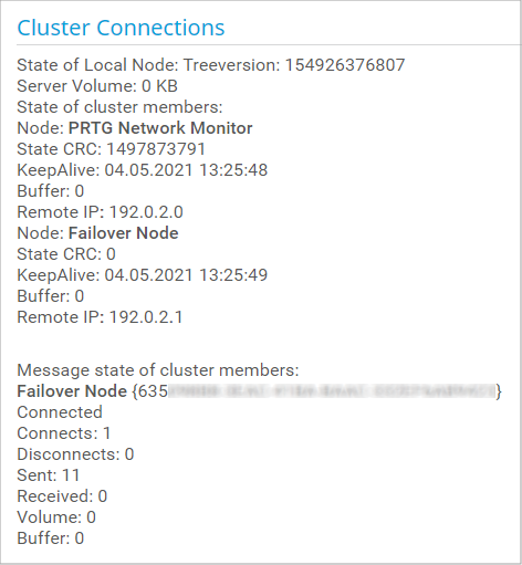 Shows internal summary information about the cluster node and the communication between the cluster nodes. You might be asked about this by the Paessler support team.