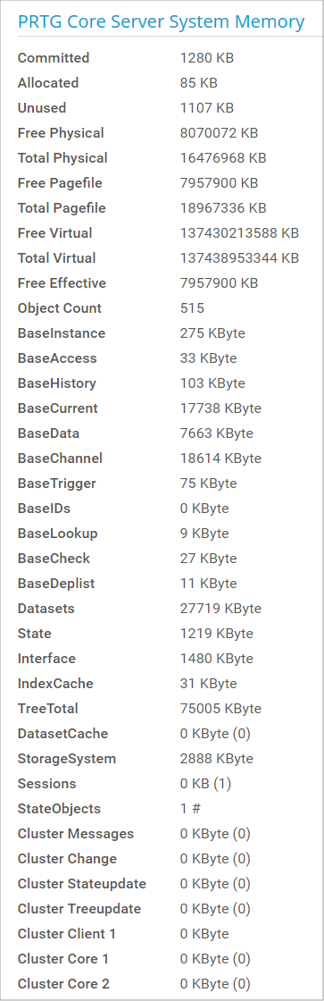 This section shows machine-oriented information regarding the memory usage of the PRTG core server system.