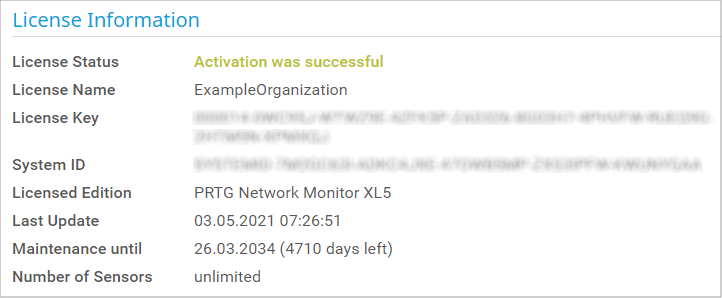 The License Name (PRTG Network Monitor only), license key, and system ID make up your license information.