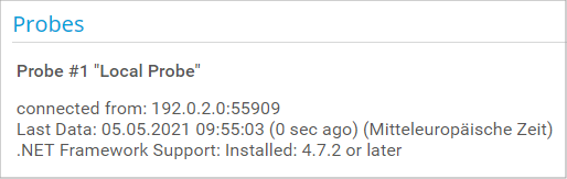 Shows information about the connection status. If the probe is connected, the field shows the source IP address and port number used by the probe. For the local probe, the IP address is always 127.0.0.1. You also see information about the date when the last data packet was received from the probe.