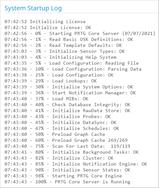 This section shows the log information that was created during the last startup of the PRTG core server.