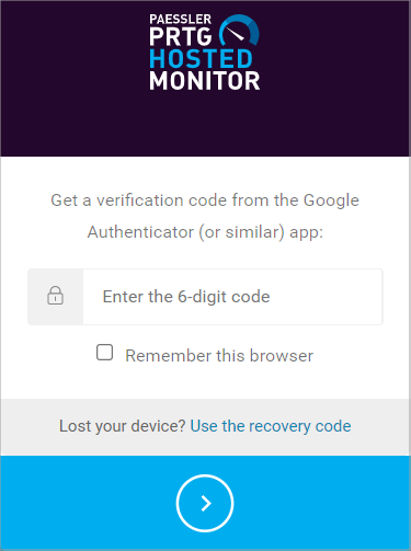 After you set up multi-factor authentication, the next time you log in to the PRTG Hosted Monitor web portal, you see an additional login screen.