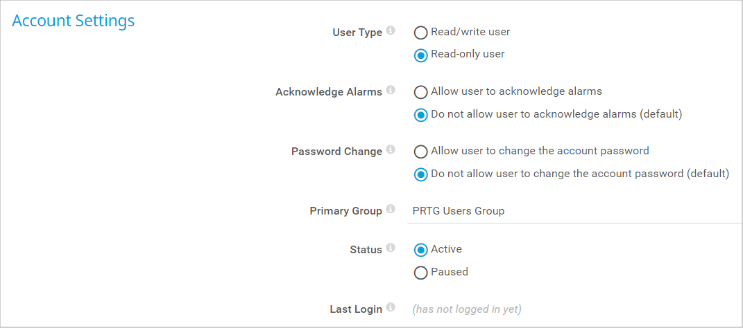 - Paused: Cannot log in to the PRTG web interface. Use this option to temporarily deny access for this user.