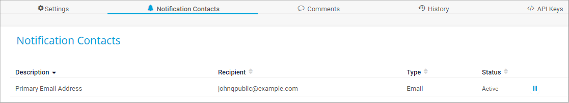 The Notification Contacts tab shows a list of all notification contacts of the selected user account.