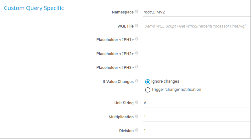 In your WQL script, you can use up to three placeholders to which you can assign a value in this field. Enter a string for variable <#PH1> or leave the field empty.