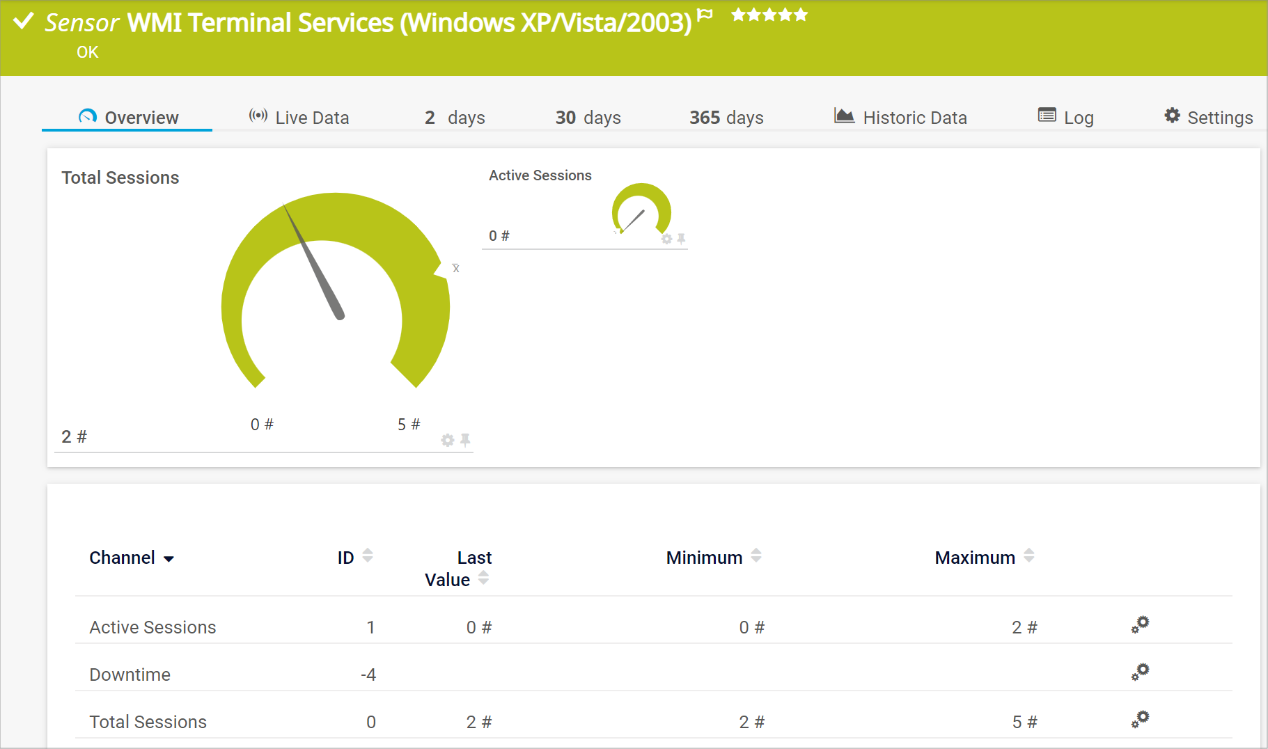 The WMI Terminal Services (Windows XP/Vista/2003) sensor monitors the number of sessions on a Windows Terminal Services (Remote Desktop Services) server via Windows Management Instrumentation (WMI).